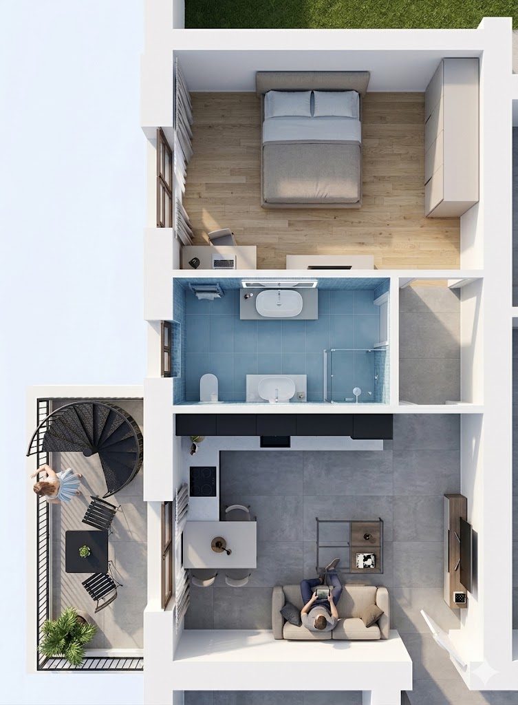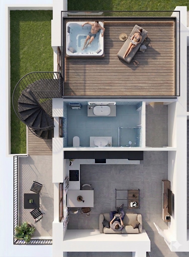 COMUNE DI DESENZANO DEL GARDA – LOCALITÀ CENTENARO. In un nuovo ed esclusivo complesso residenziale di sole sei unità abitative, proponiamo l’ultima disponibilità: un moderno appartamento bilocale posto al piano primo. L’immobile è composto da una luminosa zona giorno con angolo cottura, servita da porta finestra che conduce alla balconata privata. L’esclusività è garantita dall’accesso, tramite scala personale dalla balconata, direttamente al solarium di proprietà sovrastante, uno spazio ideale per il relax con vista aperta. Un disimpegno conduce alla zona notte, che ospita un bagno finestrato e una camera matrimoniale. Tutto nuovo, in migliore classe energetica esistente sul mercato, con impianto fotovoltaico e totale assenza di spese condominiali. Possibilità di completare la proprietà con posti auto coperti e autorimessa. POSIZIONE E SERVIZI: Centenaro dista pochi minuti dal Castello di Desenzano (4 km), dalle spiagge di Rivoltella (5 km) e dal suggestivo lungolago (6 km). Comodo ai centri commerciali Le Vele e Il Leone (8 min) e all’autostrada A4. Soluzione perfetta anche per locazioni turistiche a breve termine.
